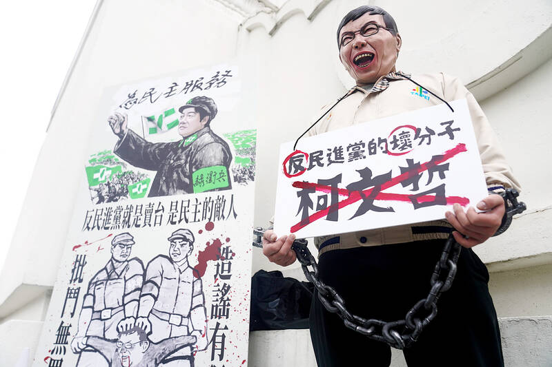 Against a stage backdrop showing a picture of a solemn-looking President William Lai (賴清德) and the Presidential Office Building, many attendees decried what organizers said was the political persecution of Ko by the government.