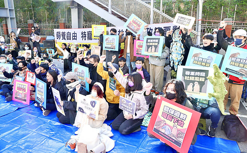 Members of a pet ownership alliance and dozens of pet owners yesterday staged a sit-in outside the Legislative Yuan protesting the Ministry of Agriculture’s plan to ban the ownership or importation of 955 more wild animals.