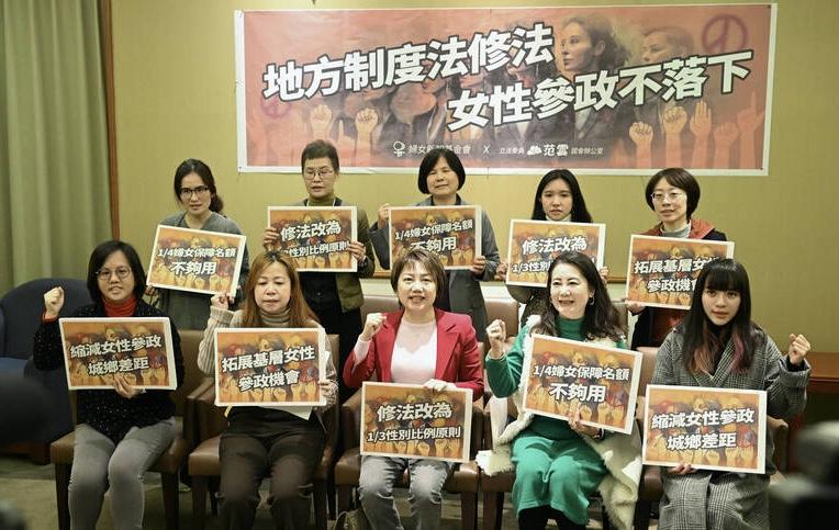 The groups at a news conference called on the Ministry of the Interior to draft an amendment as soon as possible to expand women’s opportunities to hold office and reduce the urban-rural gender disparity in local politics, working toward the goal of an even male-female split.