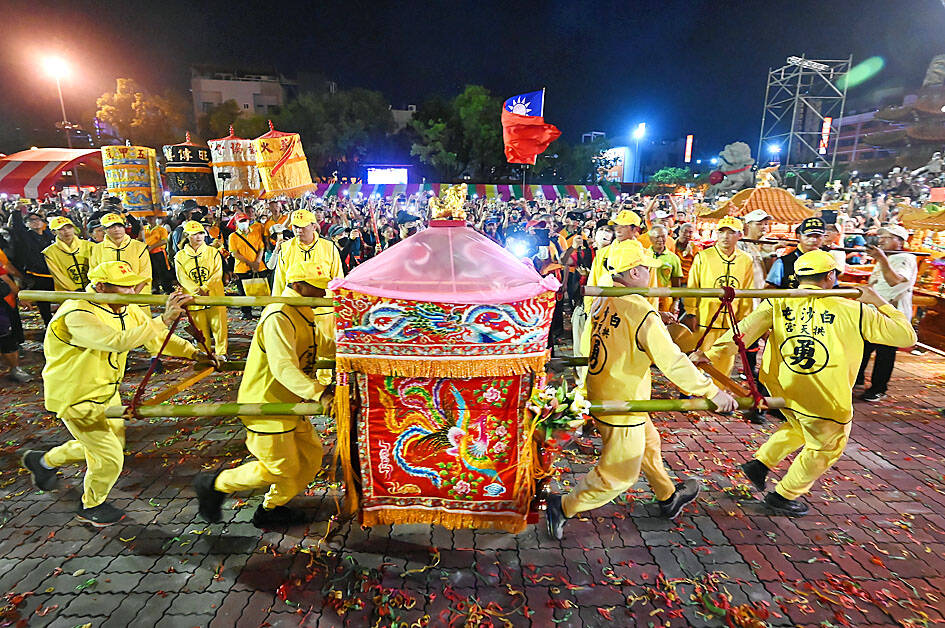 The pilgrimage from Baishatun (白沙屯) to Chaotian Temple (朝天宮) in Yunlin County’s Beigang Township (北港) is a 200-year-old tradition that sees a palanquin of the sea goddess Matsu carried on foot by participants.