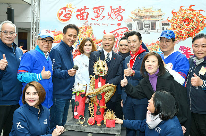 Legislative Yuan Speaker Han Kuo-yu, center, and Deputy Legislative Speaker Johnny Chiang, fifth right, promote the “Bombing Dragon” festival in Miaoli County at a Legislative Yuan news conference yesterday. The festival, to run from Feb. 6 through Feb. 14, is held during the Lantern Festival every year and involves performers maneuvering a dragon as people shoot off firecrackers near them.