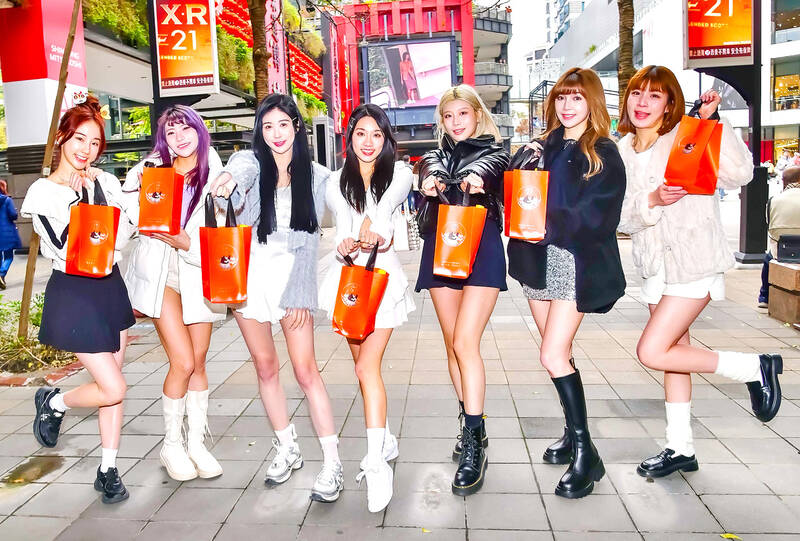 The Leopard Girls, cheerleaders of Taiwanese professional basketball team the Taiwan Beer Leopards, pose for a photograph during a meet and greet event with fans at the Xiangti Avenue Plaza in Taipei’s Xinyi District yesterday.