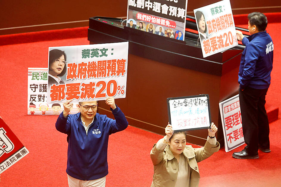 KMT and Taiwan People’s Party (TPP) lawmakers cut NT$93.98 billion (US$2.9 billion) from the central government’s general budget on Friday.