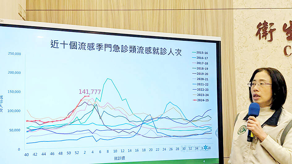 CDC Epidemic Intelligence Center Deputy Director Lee Chia-lin (李佳琳) said there were 141,777 hospital visits for flu-like illnesses between Jan. 12 and Saturday, the highest for the week in 10 flu seasons.