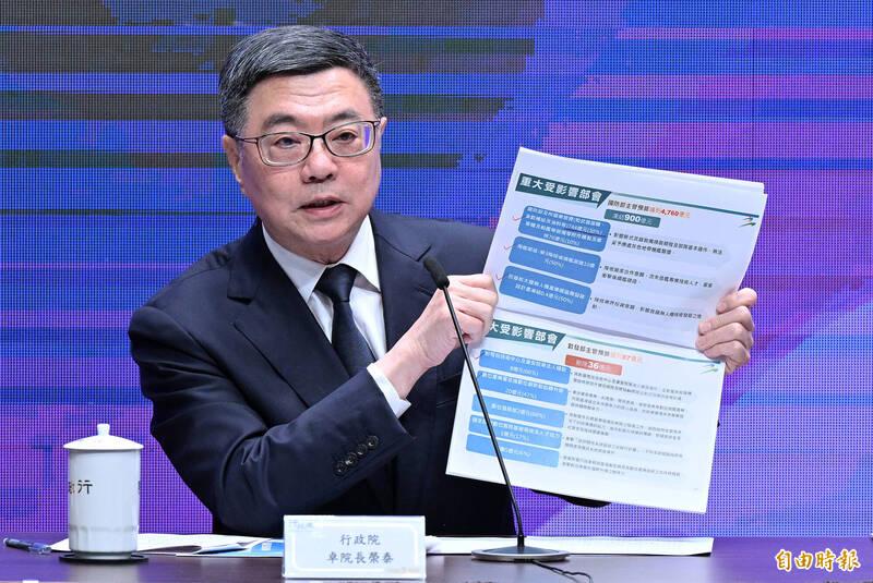 The Executive Yuan is considering issuing a request to the legislature to rethink the proposed budget cuts and to freeze 50 percent of subsidies to local governments, Premier Cho Jung-tai (卓榮泰) told a press conference today.
