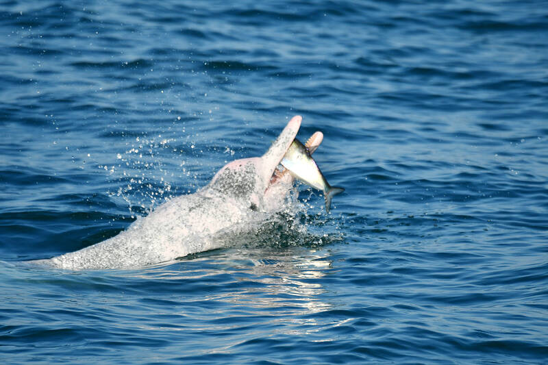 The agency’s research investigates white dolphins’ habitats and social networks from Taoyuan’s Zhuwei Fishing Harbor (竹圍漁港) to Tainan’s Anping Port (安平港).