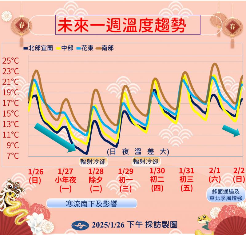 The CWA issued warnings for low temperatures and strong winds because of cold air currents from the north and strengthening northeasterly winds.