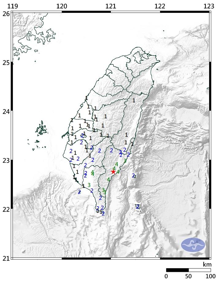 The largest intensity of 4 was felt in Taitung and Pingtung counties, which received an alert notice, while areas north of Taichung did not feel any shaking, the CWA said.