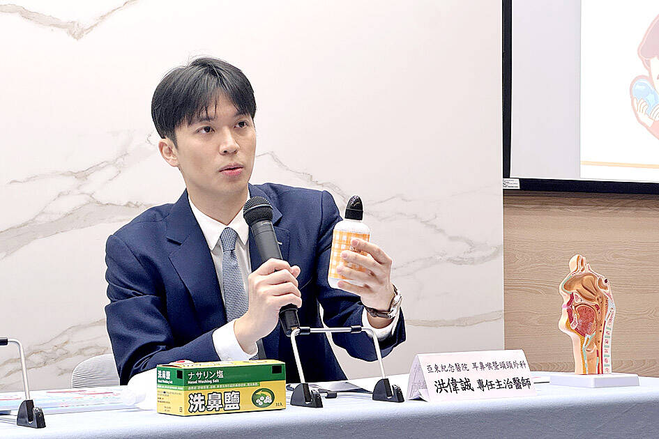 A buildup of dust, pollen, or bacteria in the nasal cavity can hinder the functioning of the nasal mucous membrane and exacerbate allergies, said Hung Wei-cheng (洪偉誠), a doctor at Far Eastern Memorial Hospital’s Otorhinolaryngology-Head and Neck Surgery Department.