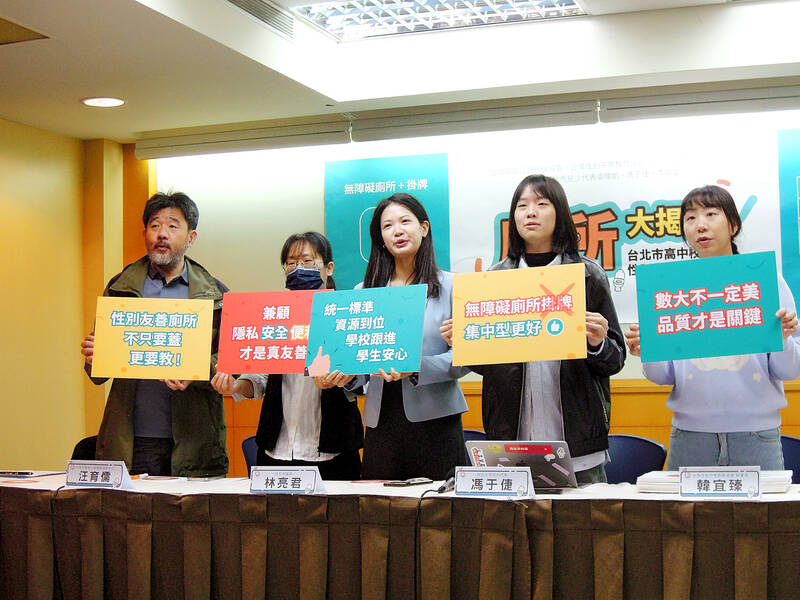 Taipei public high schools have not properly implemented a gender-friendly restroom mandate seven years after its promulgation, a coalition of groups said yesterday, urging the Taipei City Government to act.