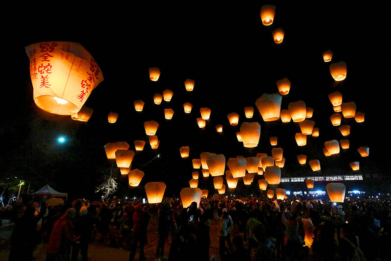 Lanterns rise into the sky at the Pingxi Sky Lantern Festival at Pingxi Junior High School in New Taipei City last night. Another sky lantern event is to take place at the city’s Shihfen Plaza on Wednesday, the day of the Yuan Xiao Festival, which is celebrated on the 15th day of the first lunar month.