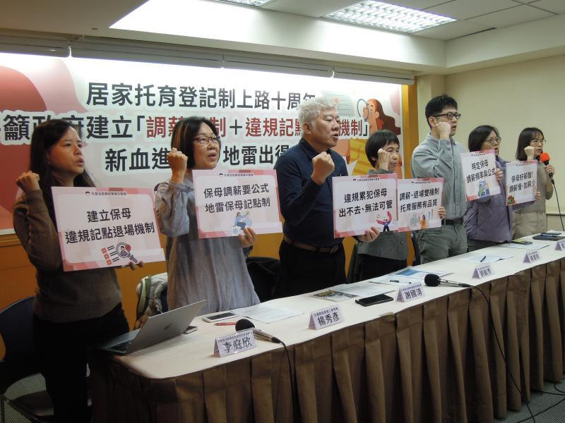 Childcare workers have seen minimal wage increases over the past 10 years, Childcare Policy Alliance spokesperson Huang Chiao-ling (黃喬齡) told a news conference.