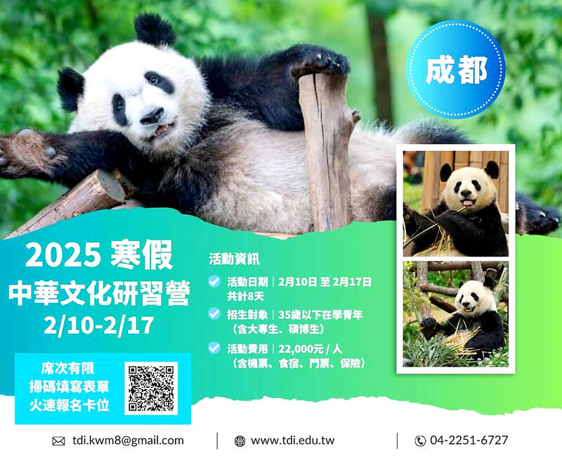 Camp participants would be hosted by the Association for Relations Across the Taiwan Straits (ARATS), which arranged the itinerary, which included a visit to the Chengdu Research Base of Giant Panda Breeding, Chengdu Radio & Television Co’s headquarters and scenic sites, the Web site said.