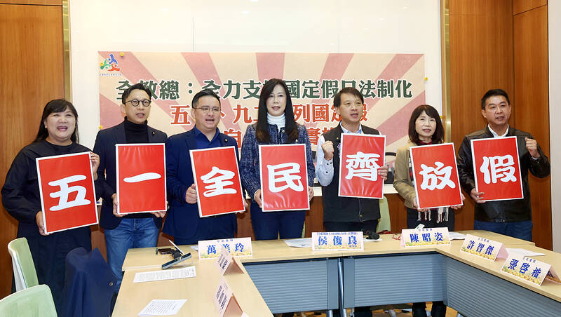 Making Workers’ Day a national holiday has obtained bipartisan consensus, with legislators from the Democratic Progressive Party (DPP), the Chinese Nationalist Party (KMT) and the Taiwan People’s Party (TPP) proposing different versions of amendments to the Act on Implementing Memorial Days and State Holidays (紀念日及節日實施辦法), the group said at a news conference in Taipei.