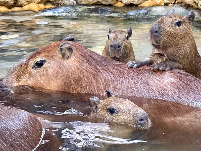 A capybara named Li Ya, a first-time mother, swims with her three pups at Shoushan Zoo in Kaohsiung in a photograph released yesterday. The pups, born over the Lunar New Year period, are Li Ma, Li La and Li Sung, named for the Chinese word for “marathon” in hopes that the family of five would live long, happy lives, the zoo said. The zoo yesterday announced the new arrivals and plans to hold a capybara meet-and-greet event at 2pm on Saturday and a separate event on Sunday at 10am to welcome the miniature donkey enclosure’s newest member, a foal named Peng-peng.