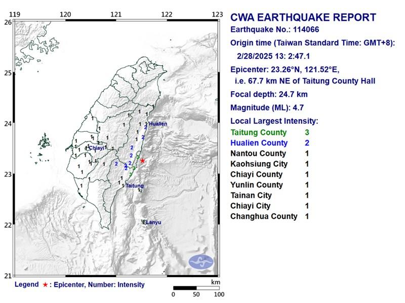 The epicenter was located 67.7 kilometers northeast of Taitung County Hall at a depth of 24.7 km, CWA data showed.