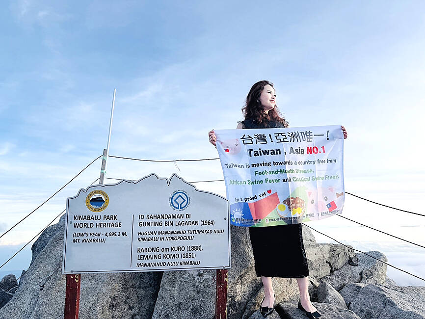 Lin Pei-ju (林珮如), director of Chiayi County Livestock Disease Control Center, on Saturday unfurled a “Taiwan, Asia No. 1” banner upon reaching the peak of Mount Kinabalu in Sabah, Malaysia, to promote Taiwan’s success in animal disease prevention.
