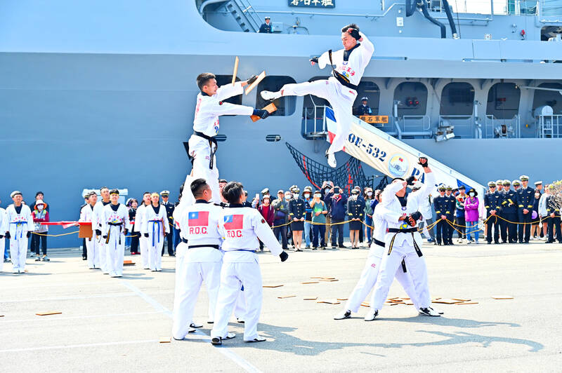 The Marine Corps martial arts team performs in front of ships with the Friendship Flotilla’s task group in Kaohsiung yesterday. The task group, made up of three ships, is scheduled to call at the Kaohsiung, Anping, Magong, Taichung, Keelung, Suao and Hualien ports until March 22 on a tour to encourage people to join the navy.