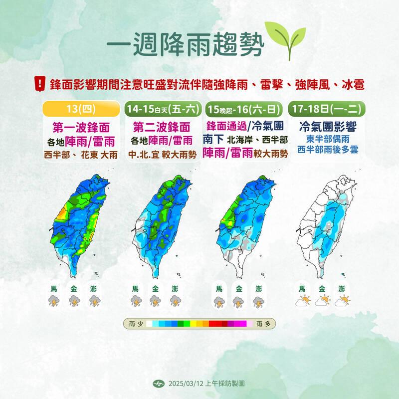 Heavier rain is expected in northern and central Taiwan tomorrow and northern Taiwan on Friday and Saturday, he said.