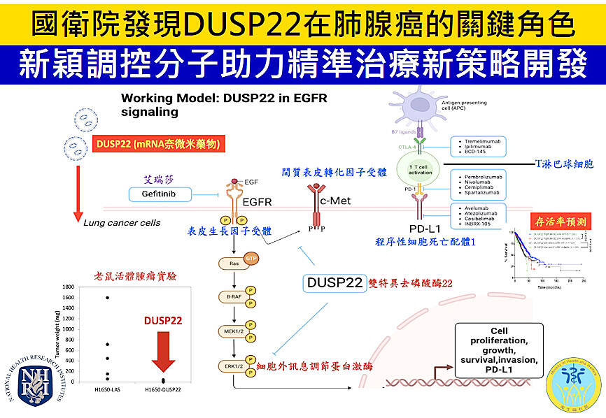 A study led by institute associate investigator Lin Wen-jye (林文傑) discovered via bioinformatics that the expression of the DUSP22 gene is linked to better outcomes for lung adenocarcinoma patients, the institute said.