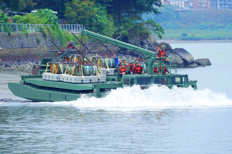 With the help of M3 amphibious rigs, the army’s 53rd Engineer Group deployed oil barrels and floating platforms as obstacles in waters off New Taipei City’s Tamsui District (淡水) in a scenario that simulated Chinese People’s Liberation Army (PLA) ships and landing craft deploying air cushions on approach to the shore.