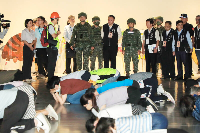 Members of the public participate in disaster drills in an undated photograph. The Taichung City Government yesterday announced that the city would hold “urban resilience exercises” on July 15 in Shalu, Wuci and Cingshuei districts, mobilizing 250,000 residents to participate in evacuation drills.