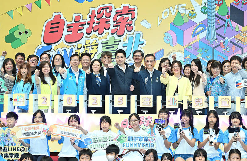 Taipei Mayor Chiang Wan-an, center, gestures along with guests at a news conference in Taipei yesterday announcing the city’s plans for Children’s Month next month. Venues in each of Taipei’s 12 districts, such as Taipei Zoo and the Children’s Amusement Park, are to host events and games for children and families, the city government said.