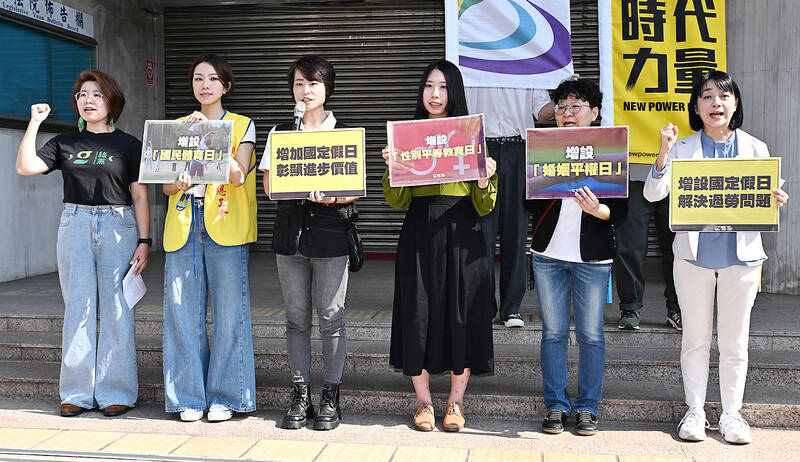 New Power Party Chairperson Claire Wang, right, and party members yesterday hold a news conference in front of the Legislative Yuan in Taipei calling for adding national holidays that represent progressive values, such as marriage and gender equality.