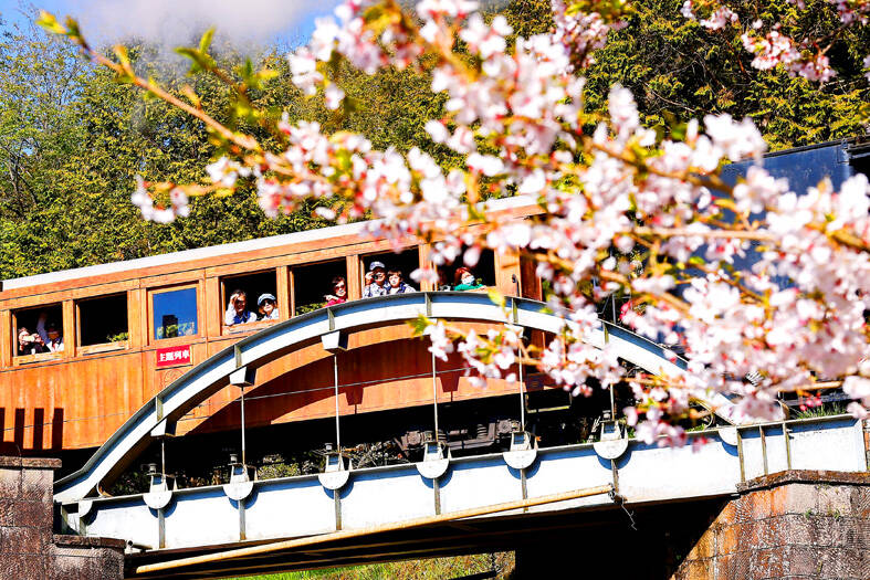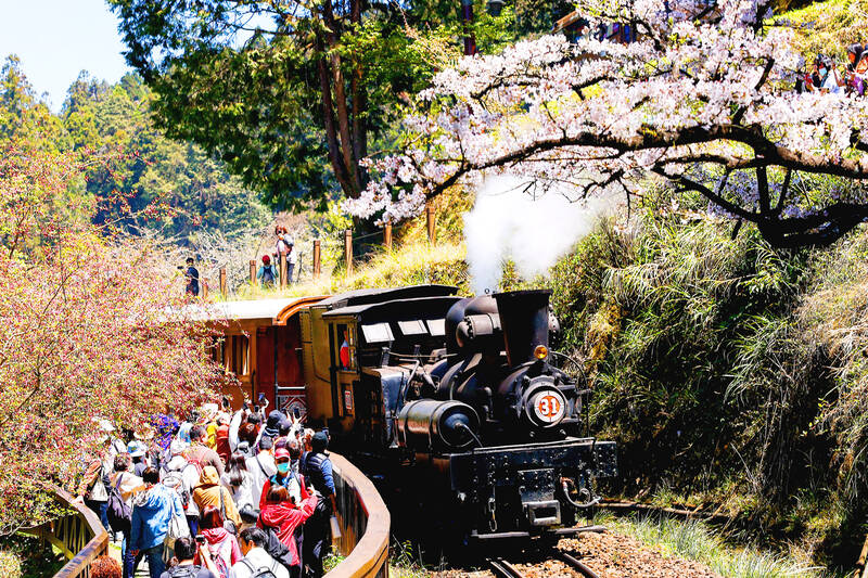 The special cherry blossom-themed train chugged up Alishan (阿里山) in the southern part of the main island for a scenic six-hour journey on a heritage line that dates from Japanese colonial times and was originally a logging railway.