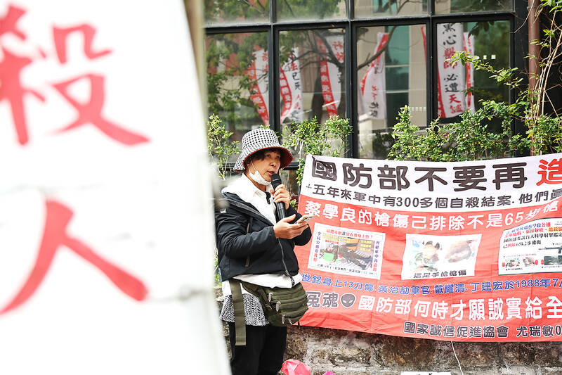 Yu Jui-ming, the mother of Republic of China Air Force staff sergeant Tsai Hsueh-liang, who died of a gunshot wound to the head at a shooting range in 2008, speaks outside Jinan Presbyterian Church in Taipei yesterday. In 2015 the High Court ruled that Tsai was killed at close range by a handgun in an accidental death and ordered the air force to pay compensation to Yu. However, Yu believes that her son was bullied by colleagues and that one of them shot him deliberately. She accuses the military of covering up the incident.