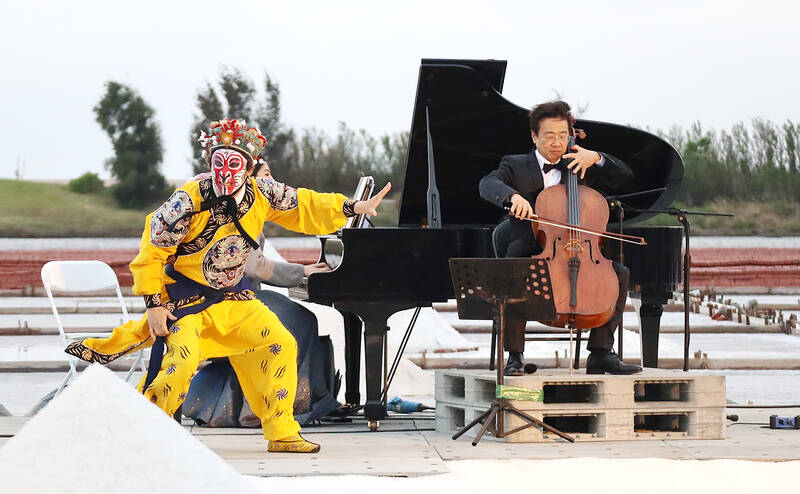 Cellist Chang Chen-chieh, right, and Beijing opera singer Chu Lu-hao perform at the Jingzaijiao Salt Fields Music Festival in Tainan’s Beimen District yesterday.