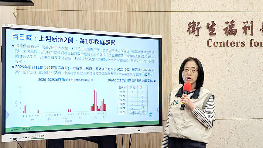 CDC Epidemic Intelligence Center Deputy Director Lee Chia-lin (李佳琳) said the two cases of whooping cough were reported in the same family, pushing the accumulated case number this year to 11, the highest for the same period in six years.