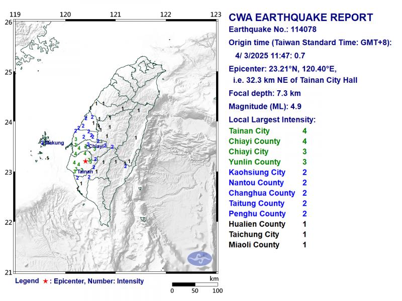 The intensity of the quake, which gauges the actual effect of a seismic event, measured 4 in Tainan and Chiayi County on Taiwan's seven-tier intensity scale, the data showed.