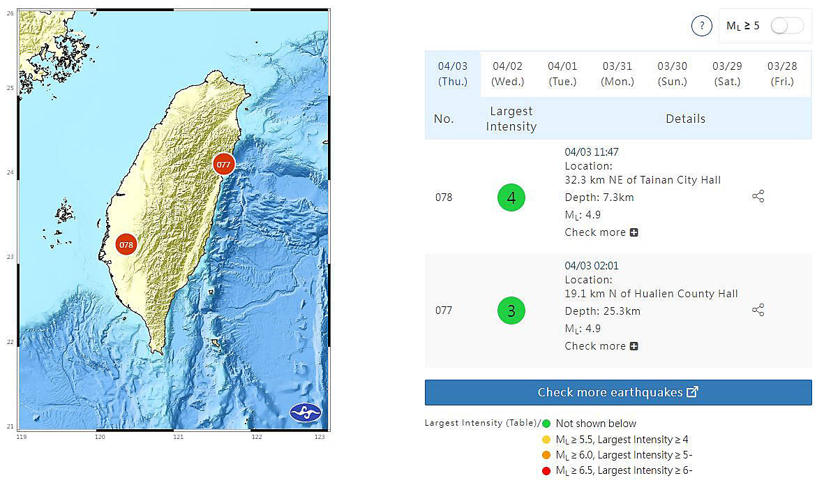 Meanwhile, a magnitude 4.9 earthquake rattled Hualien County at 2:01am yesterday. The epicenter was 19.1km north from Hualien County Hall at a depth of 25.3km, CWA data showed.