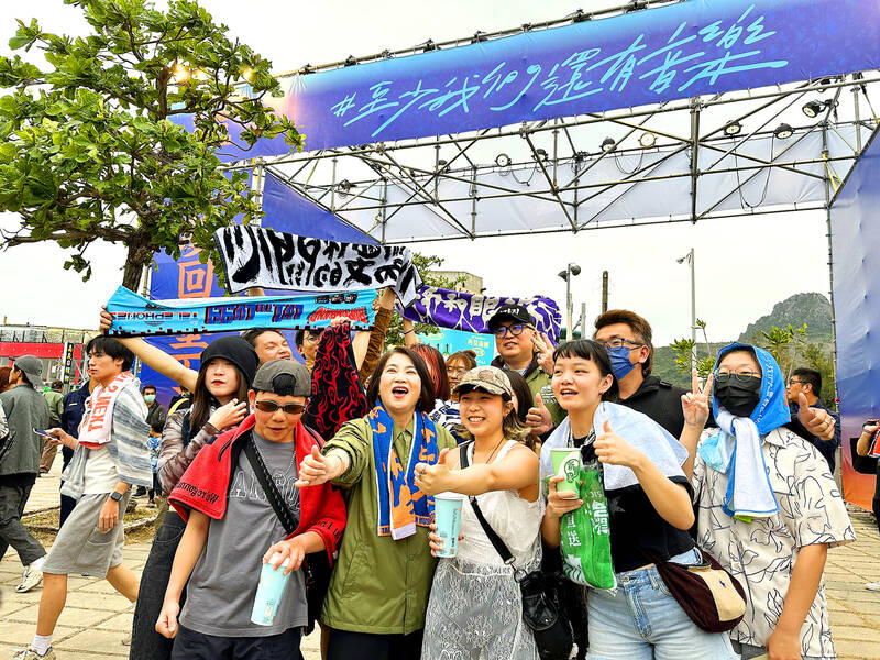 Pingtung County Commissioner Chou Chun-mi, front row, second left, poses with concertgoers at the Taiwan Music Fest yesterday at Kenting’s Dawan Recreational Area. The festival on its opening day on Thursday drew 300,000 people, the most since it began in 2021. It continues through today.