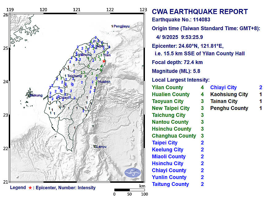 The earthquake’s intensity, which gauges the actual effect of a temblor, was highest in Yilan and Hualien counties, where it measured 4 on Taiwan’s 7-tier intensity scale.