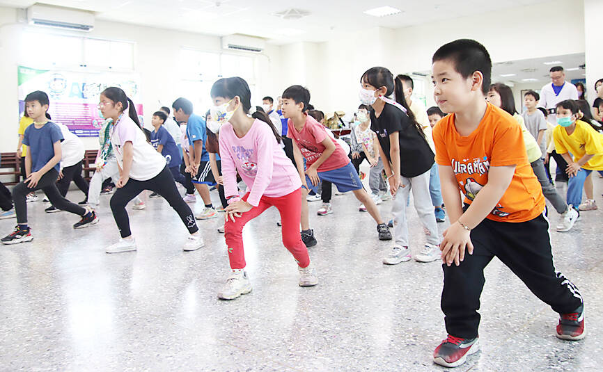 Students at Nan Jing Elementary School in Chiayi County’s Shueishang Township do stretches while participating in a dance activity on campus yesterday. In celebration of a local radio station’s 75th anniversary, the station invited members of Wen Shyang Dance Company to teach children to dance and to enjoy creative art performances.