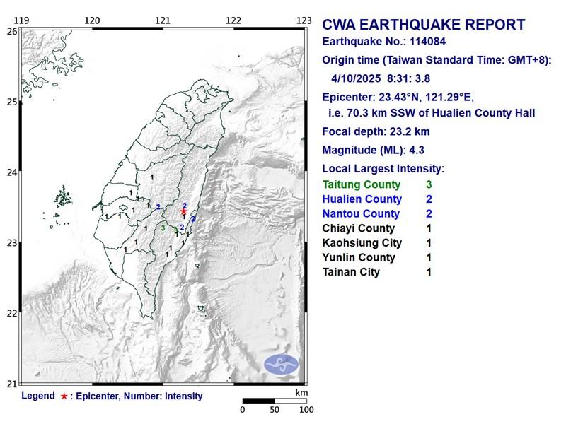 The quake also measured an intensity of 2 in Hualien and Nantou counties, the CWA said.