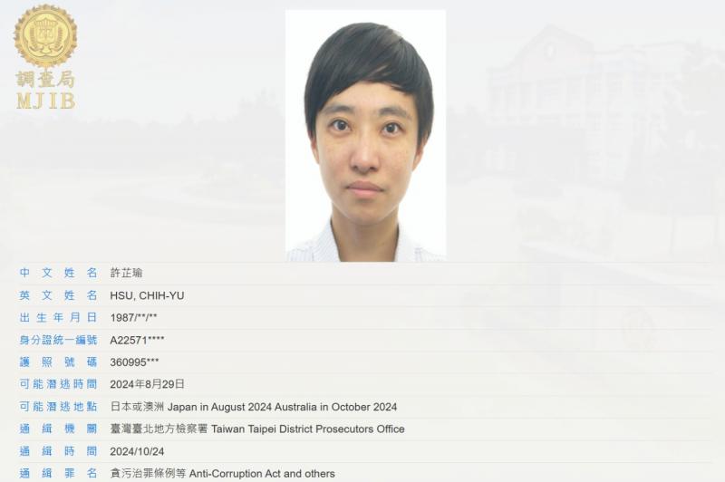The MJIB said it would continue to investigate her whereabouts and seek legal assistance from countries where Hsu might have fled to.