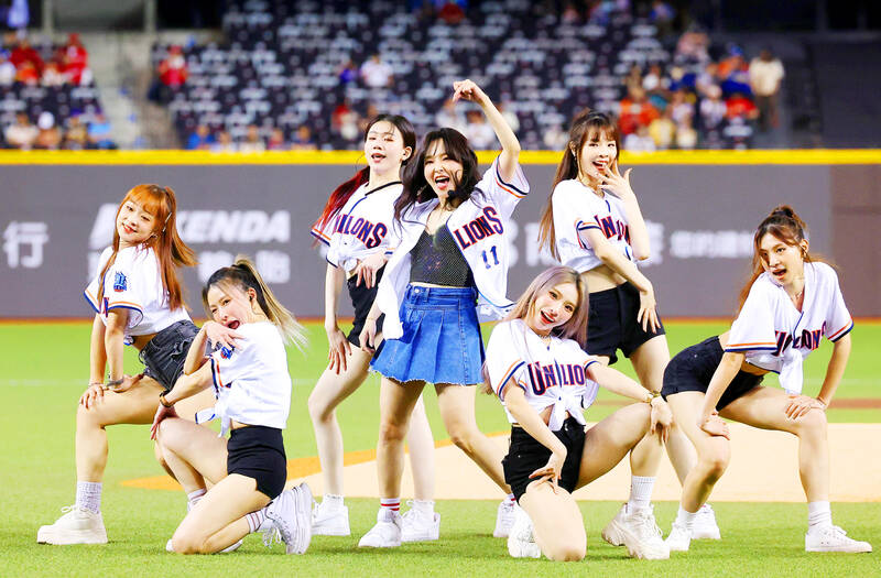 Japanese singer and actress Aisa Senda, center, performs alongside Uni-President 7-Eleven Lions (Uni-Lions) cheerleaders at the Taipei Dome yesterday. The Uni-Lions of Taiwan’s Chinese Professional Baseball League and Japan’s Saitama Seibu Lions jointly held the 10th annual “Two Lions” exchange event, drawing more than 13,000 spectators to the Taipei Dome yesterday. The event concludes today.