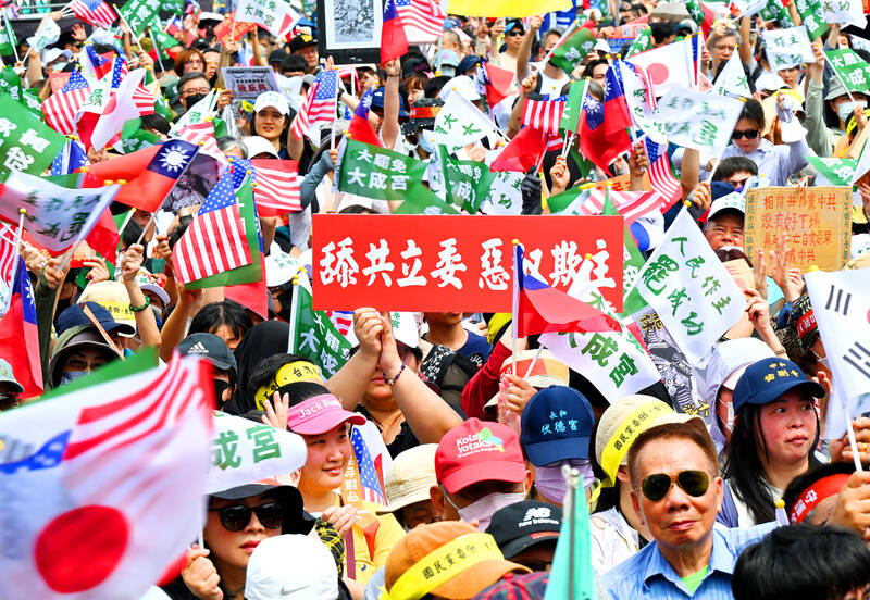 Participants wave flags of the Republic of China, South Korea and Japan as well as various signs at a rally against China’s “united front” efforts organized by YouTuber Pa Chiung on Ketagalan Boulevard in front of the Presidential Office Building in Taipei yesterday.