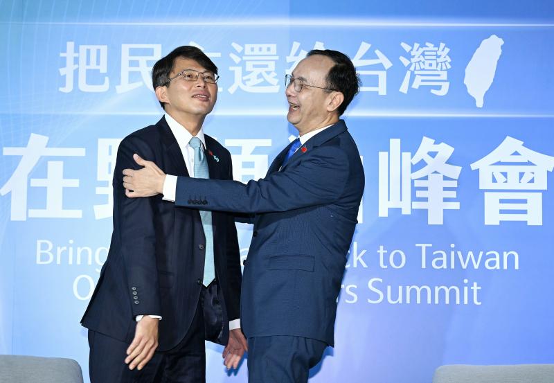 The Chinese Nationalist Party (KMT) and Taiwan People’s Party (TPP) today held a livestreamed opposition leaders summit to discuss major national issues, including US tariffs, political reform and recall campaigns.