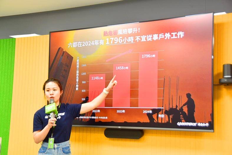 Greenpeace East Asia climate and energy campaigner Lydia Fang (方君維) told a news conference that high temperatures not only raise environmental concerns, but also affect the economy and society.