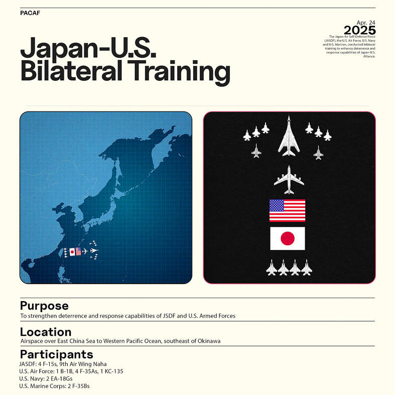 US and Japanese military aircraft on Thursday conducted a bilateral aerial exercise off eastern Taiwan as part of a joint mission to bolster training, strategic deterrence and regional stability, the US Indo-Pacific Command (PACOM) said yesterday.