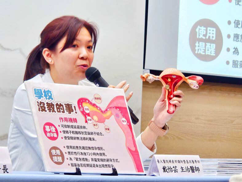 Morning-after pills are a class of contraceptive medicine that should be taken within the first 72 hours after unprotected sexual intercourse, National Taiwan University Hospital Department of Genetic Medicine doctor Tai Yi-yun (戴怡芸) said.