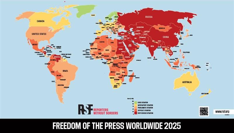 Taiwan ranked 24th in the 2025 World Press Freedom Index released by Reporters Without Borders (RSF) today, climbing three places from the previous year at a time when press freedom declined in most countries.