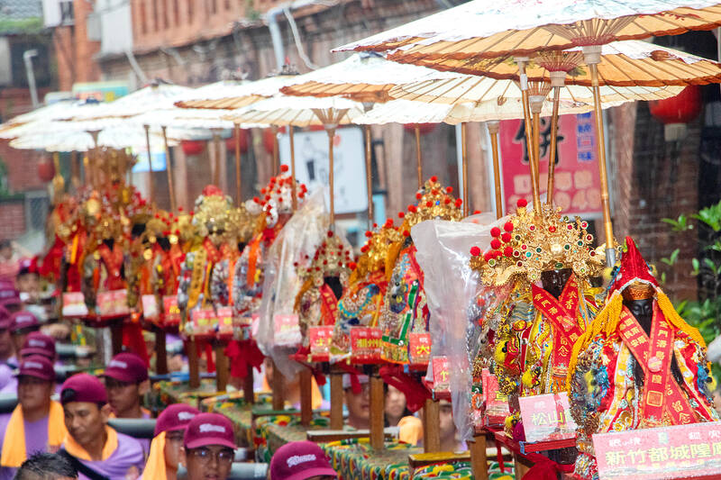 City gods, or Chenghuang, take part in a procession marking the 345th anniversary of the Wudao Chenghuang Relocation in Kinmen County yesterday. The event commemorates the Qing-era relocation of the original Chenghuang Temple, said to have been built in 1387, to its current location by Kinmen’s first township governor.