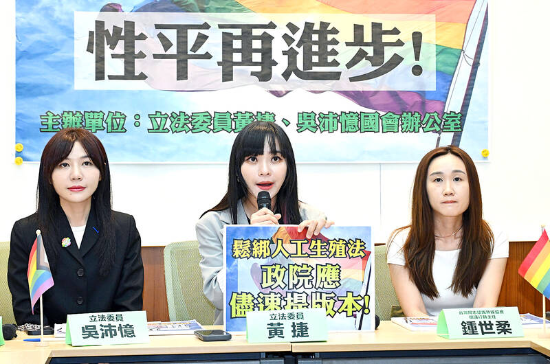 Two Democratic Progressive Party (DPP) legislators yesterday urged the government to submit bills that would extend the use of assisted reproduction to single women and same-sex female couples, and promote gender equality education.
