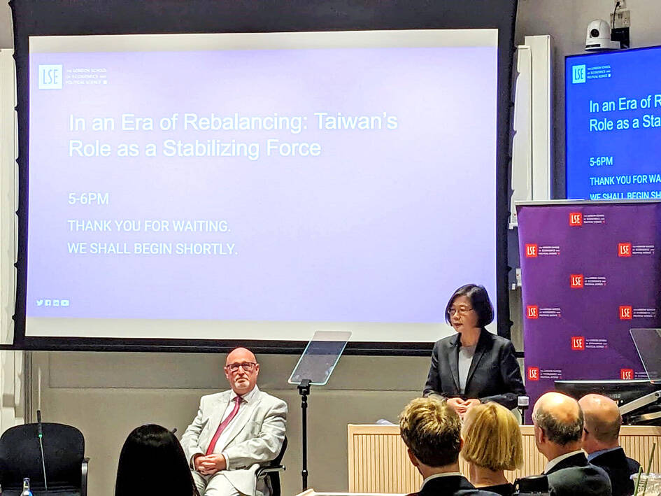 Taiwan’s resilience will help the country overcome the challenges of the global trade crisis created by the White House’s tariff policies, former president Tsai Ing-wen (蔡英文) said on Saturday in a speech at her alma mater, the London School of Economics and Political Science (LSE).