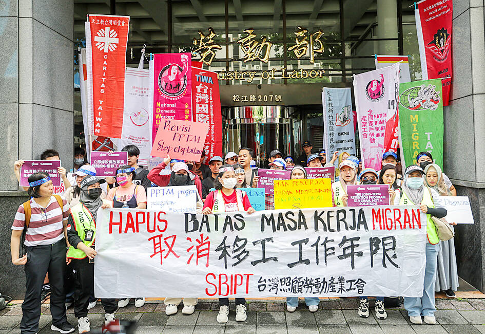 Migrant worker advocacy groups yesterday protested in front of the Ministry of Labor in Taipei, calling on the government to abolish work-term limits for blue-collar migrant workers.